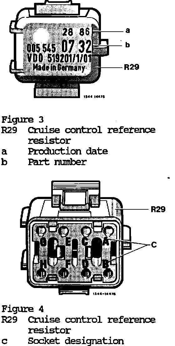 In case of customer complaints regarding the cruise control, the reference resistor (Fig. 3 and 4) must be tested with a multimeter as outlined below, before replacing the cruise control amplifier.