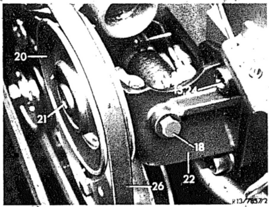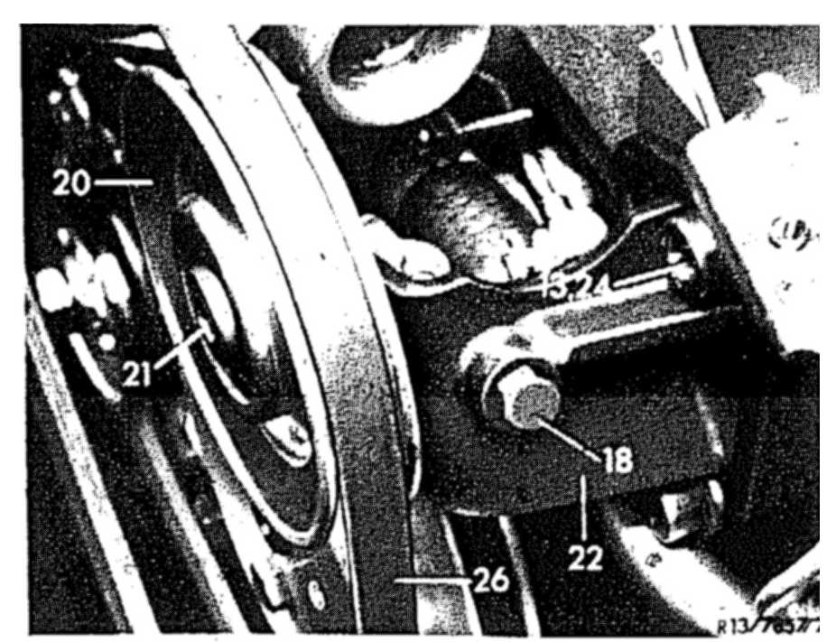 12 Tension adjusting screw (18) until the specified V-belt tension is attained. Tighten necked-down screw (21).