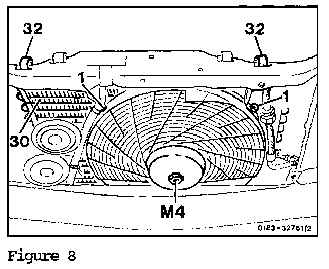 1. Charge the A/C system with R12 as specified in the chart, Refrigerant Capacities. Run engine at idle and engage compressor at pushbutton panel.2. Test function of auxiliary fan (M4, Figure 8) via the 16 bar pressure switch by bridging pins on switch. on engines 102 and 602 check for proper rotation of the auxiliary fan and proper function of the electromagnetic clutch.