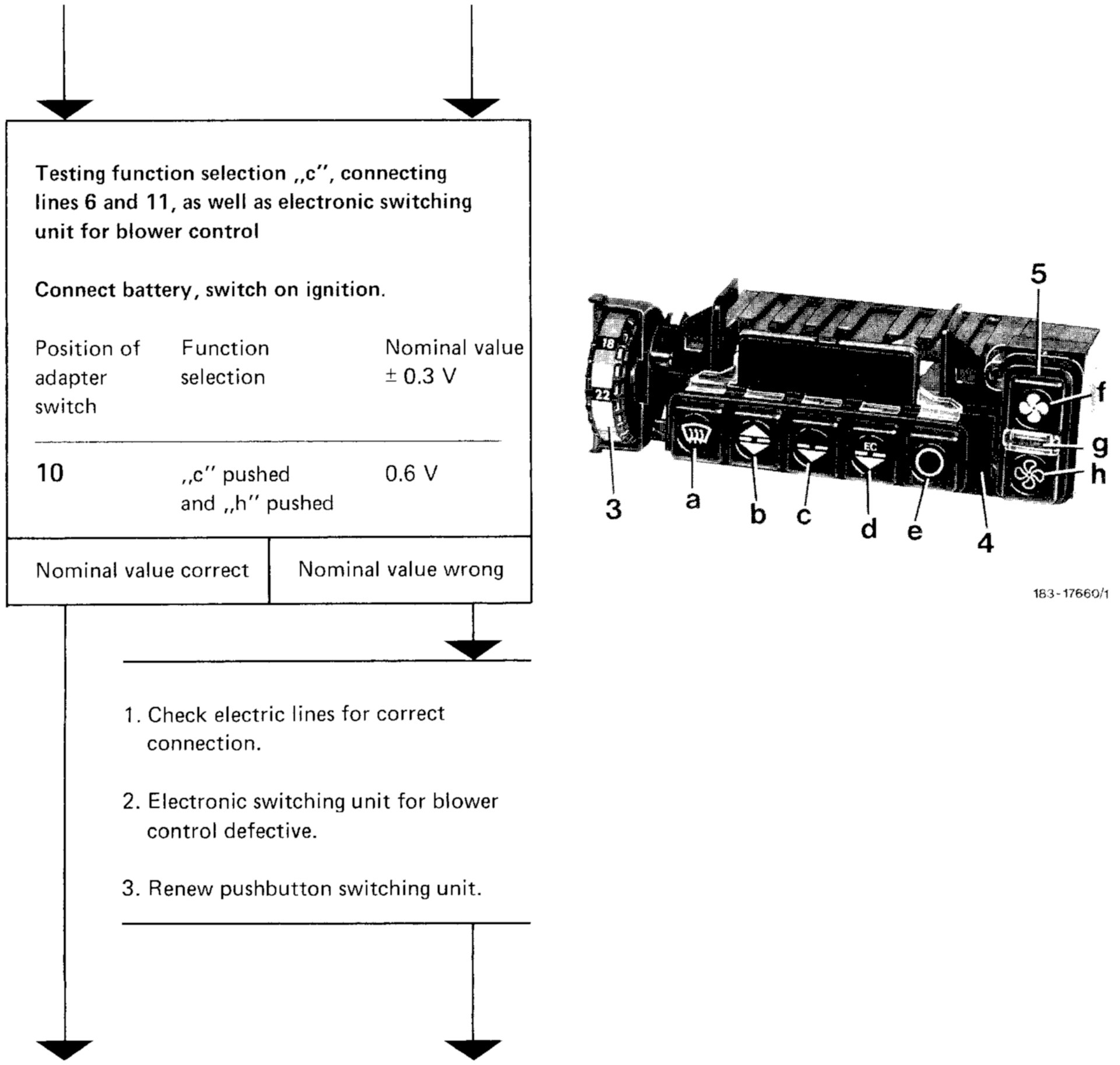 TESTING FUNCTION SELECTION "c", CONNECTING LINES 6 AND 11, AS WELL AS ELECTRONIC SWITCHING UNIT FOR BLOWER CONTROL:Wiring Diagram: