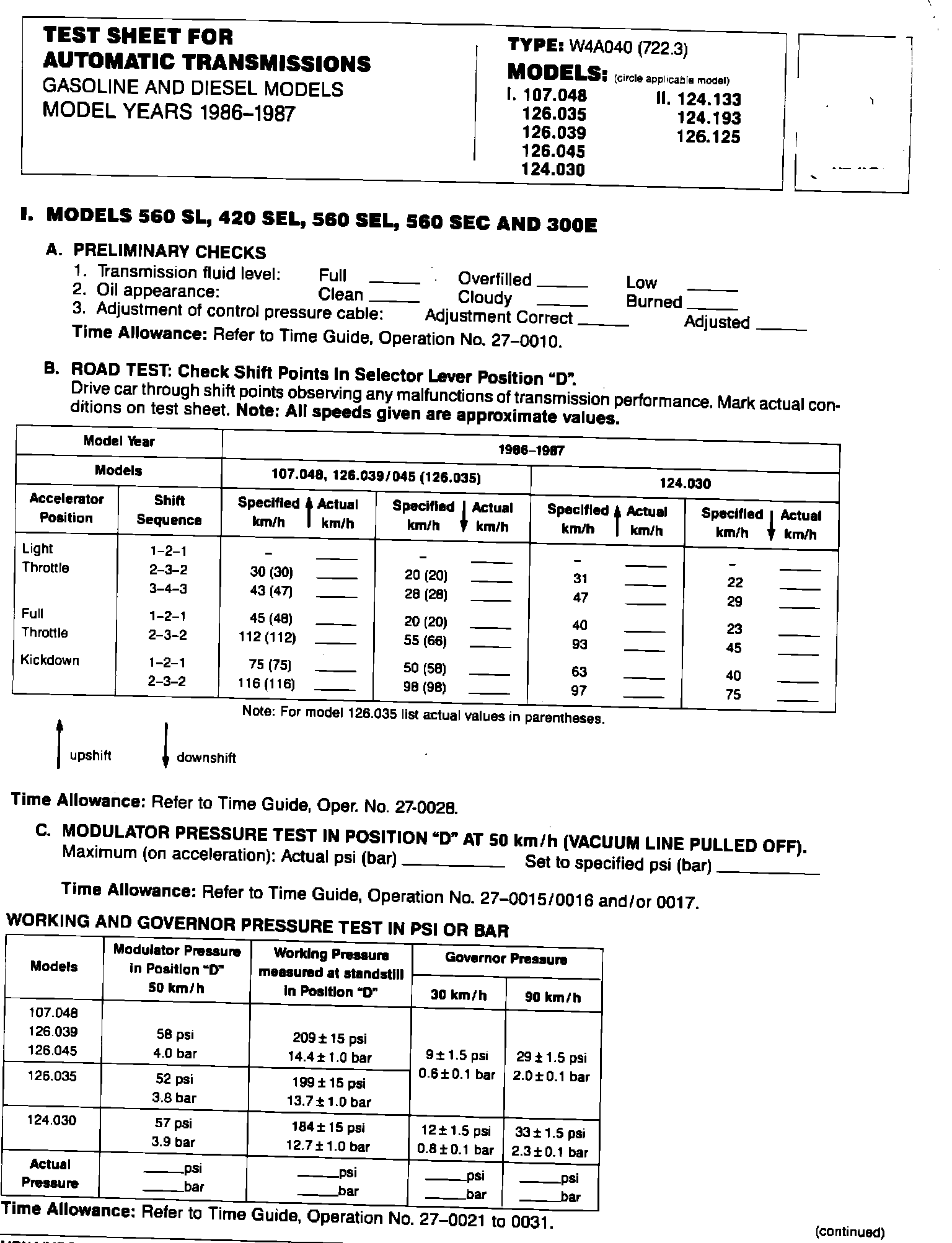 SUBJECT: TEST SHEET FOR AUTOMATIC TRANSMISSION, TYPE W4A040 MODEL YEARS 1986 - 1987 WHEEL ALIGNMENT AND CHASSIS MEASUREMENT WORKSHEET, ALL MODELS