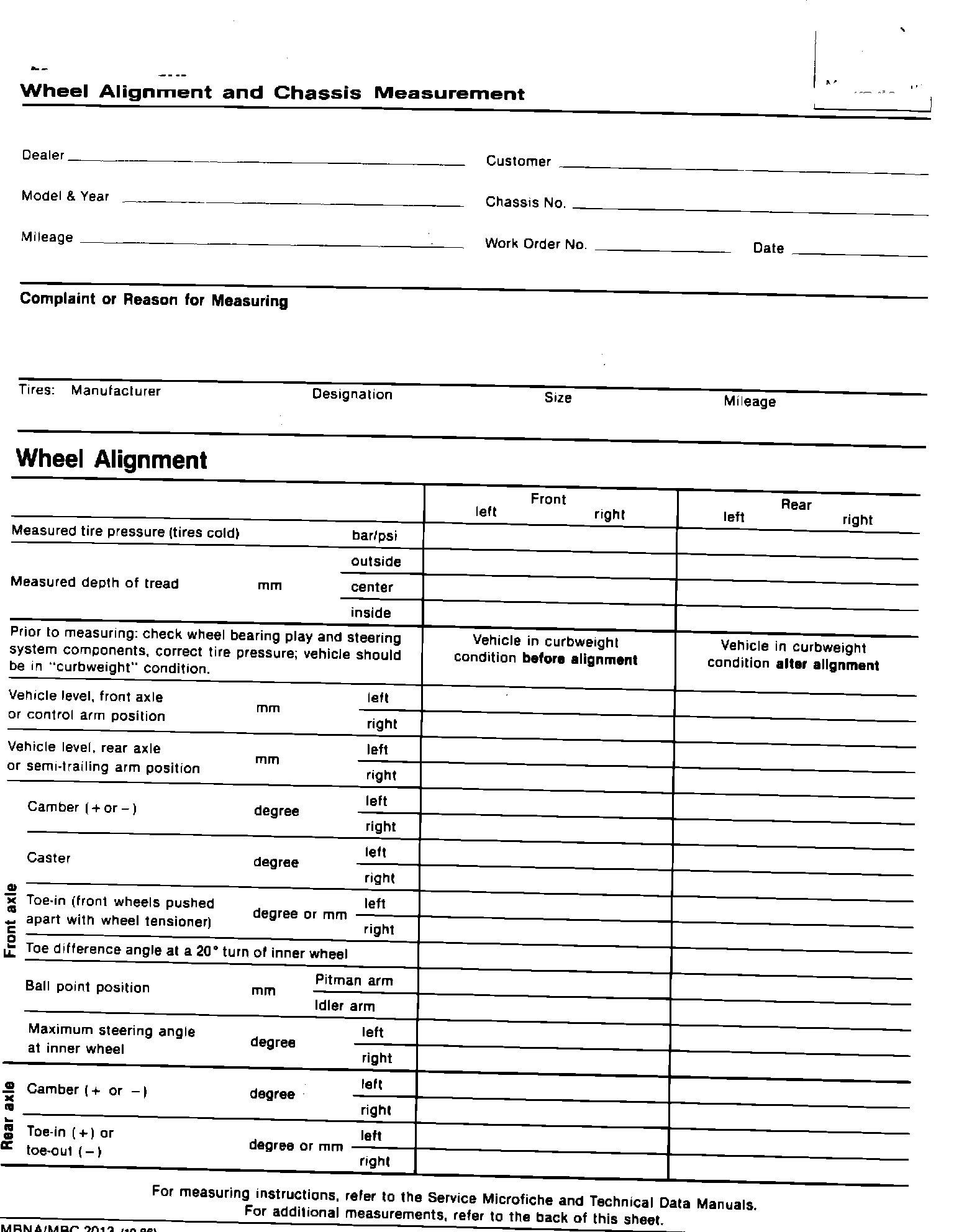 Test Sheet for Automatic Transmissions, Type W4A040, MBNA/MBC 441 (new) Test Sheet for Automatic Transmissions, Type W4A020, MBNA/MBC 442 (new) Has been revised Ref. MBNA 9970 Wheel Alignment and Chassis Measurement Worksheet, MBNA/MBC 2013 (revised)