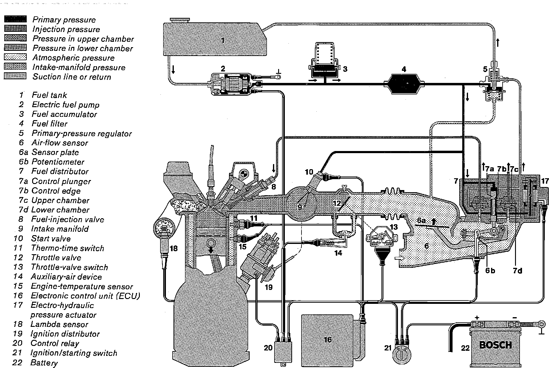The electronic portion of the system consists of an airflow sensor position indicator, electro-hydraulic actuator (EHA), thermo time switch, coolant temperature sensor, electronic control unit (ECU), transistorized ignition unit, throttle valve switch, altitude correction device, lambda control, and oxygen sensor.