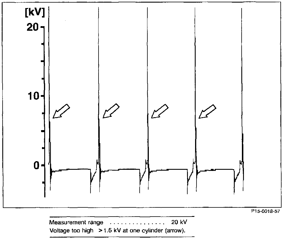 Cause: Excessive resistance at secondary side (ignition cable 4, distributor rotor, ignition coil, or high voltage output).