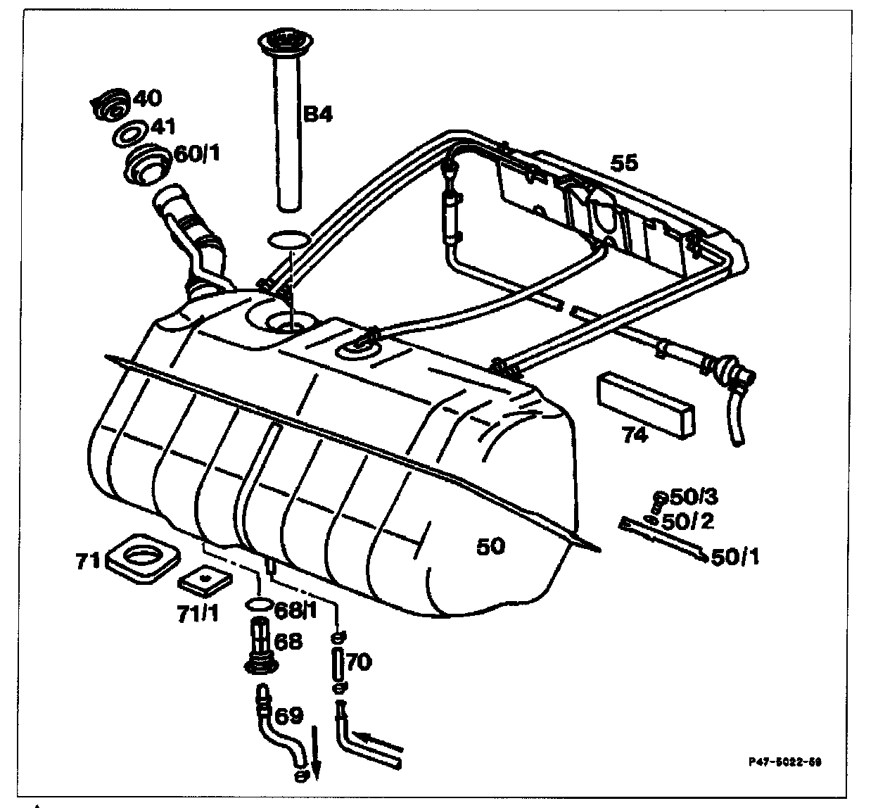 Installation note: Stick sealing pads (71, 71/1) and soundproofing strips (74) with MB universal adhesive 000 989 92 71 if necessary. Install reinforcing plates (5011) with reinforced side between bracket and fuel tank.