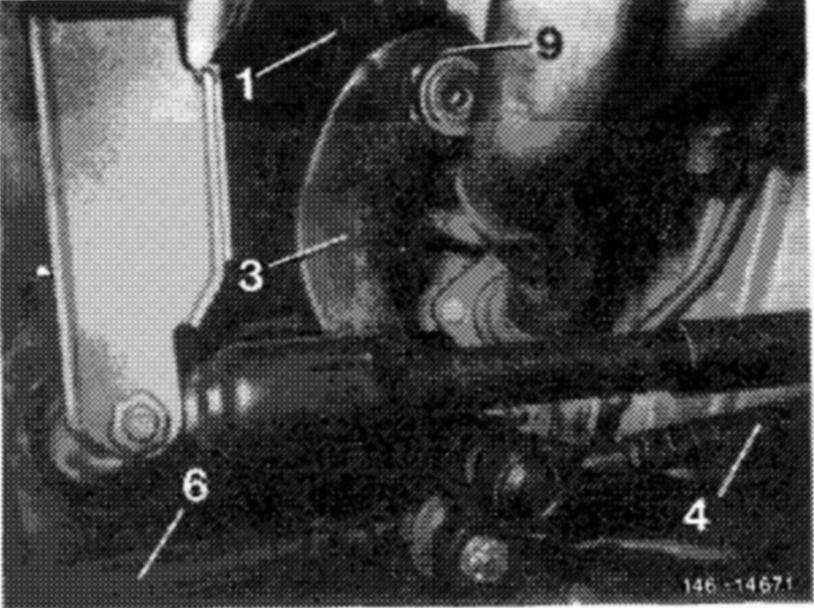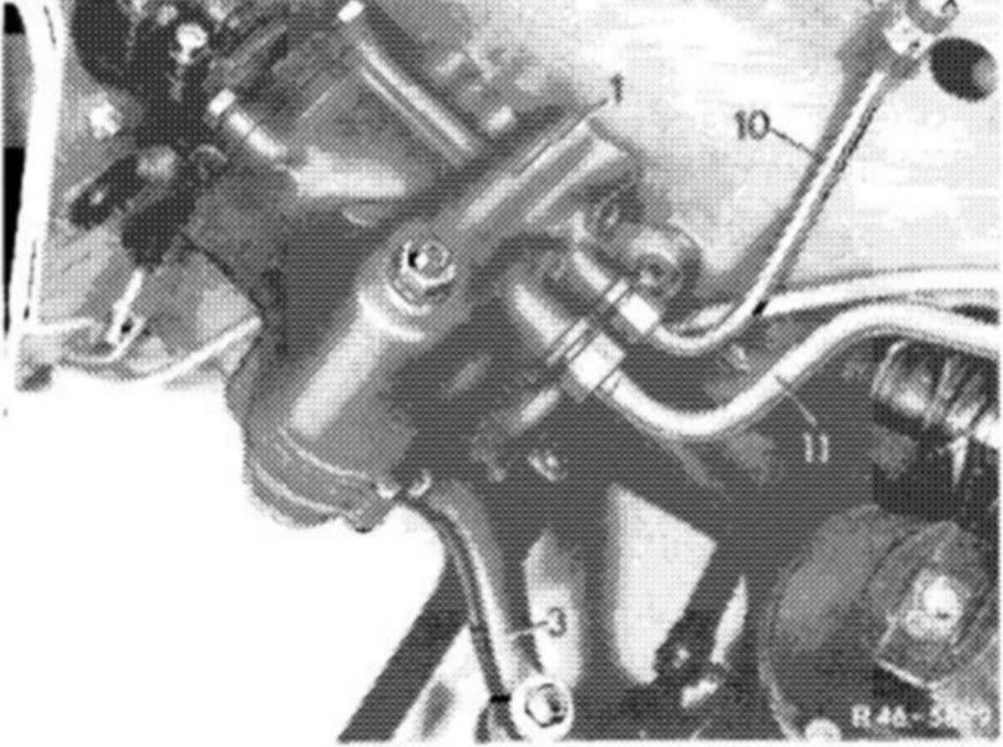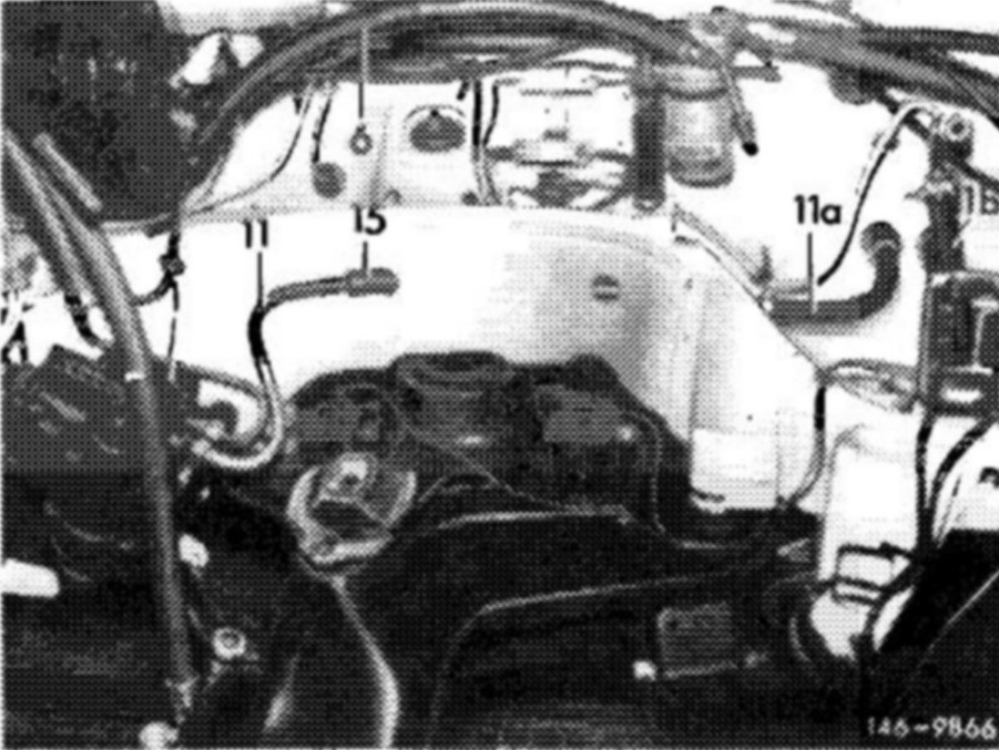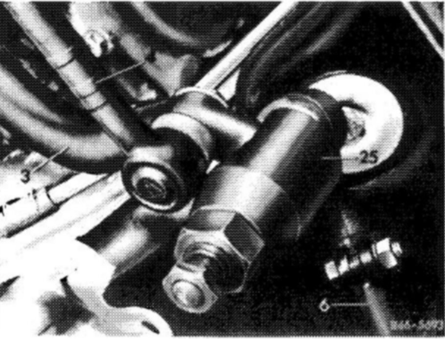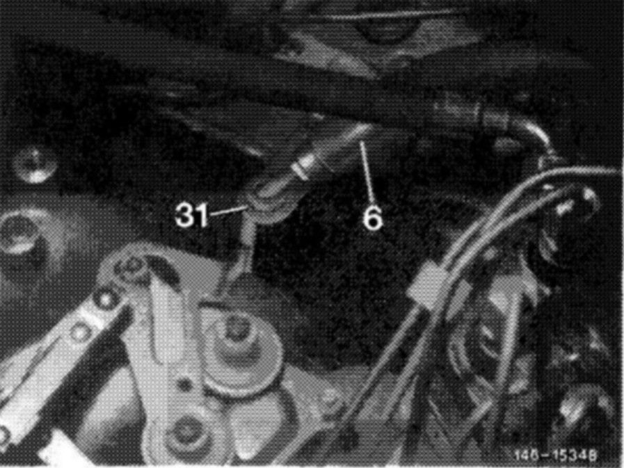 On vehicle engines 110 with increased output (production starting April 1978) the high-pressure expanding hose including rubber grommet is attached in holder (31).