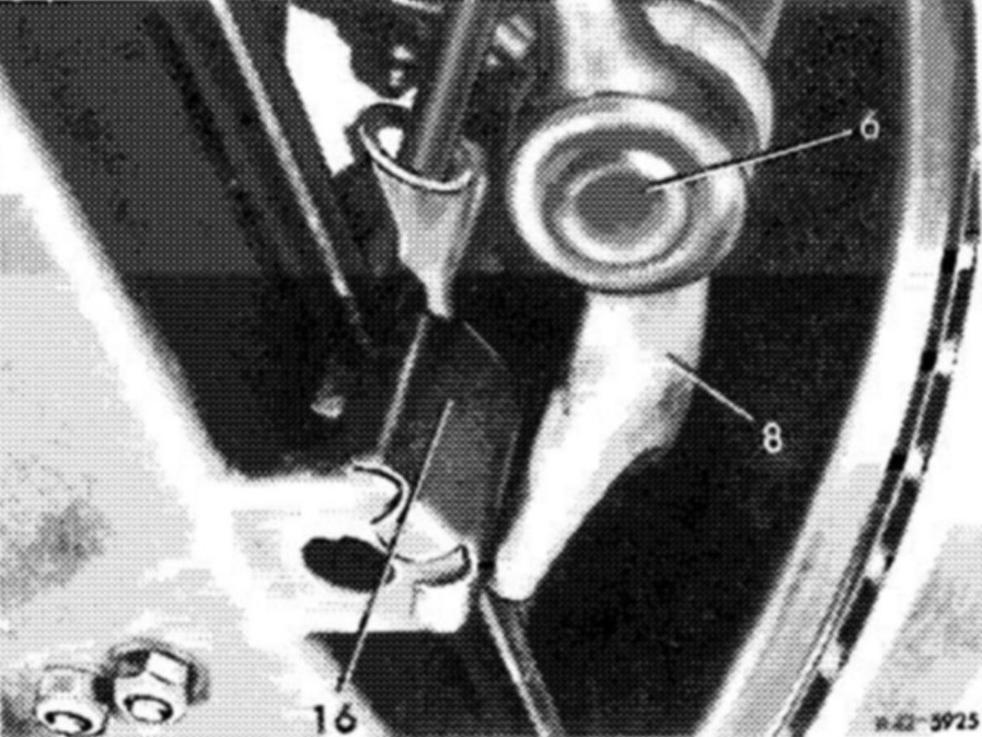 34. Turn steering completely to the left and to the right while checking whether steering knuckle arm (8) rests each time against stop (16) of lower control arm.