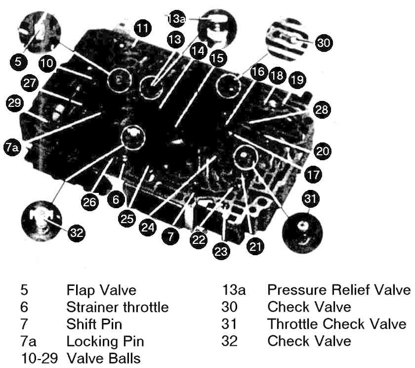 NOTE: Valve ball (28) is not installed on transmissions 722.315 and 722.303. A conical spring is located under valve ball (16). On some shift valve housing versions a pressure relief valve (13a) is installed instead of valve ball (13).