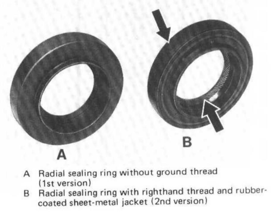 Note: Starting November 1979, only radial sealing rings with oil return feed thread and rubber-coated sheet-metal jacket will be available (B, arrows). This change eliminates the ground thread on universal flange.