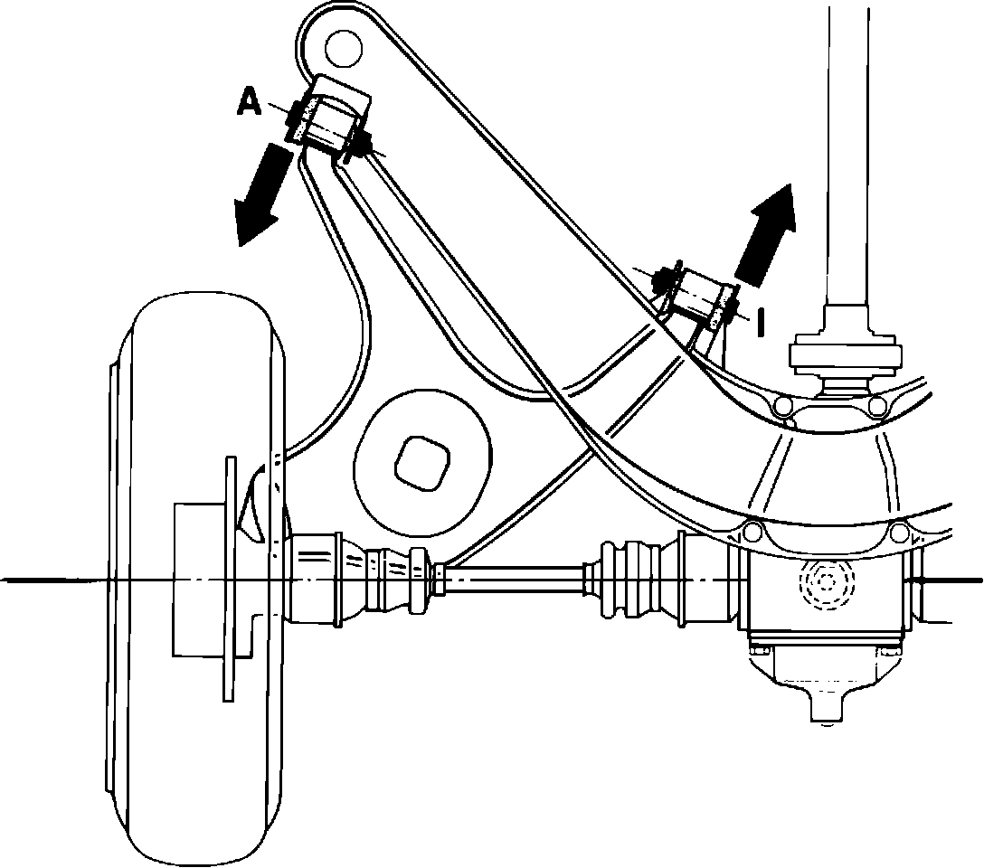 Toe-in of the rear wheels result from the location of the rear axle carrier and the semi-trailing arms. Toe-in value depends within certain limits on the semi-trailing arm position of the rear axle.