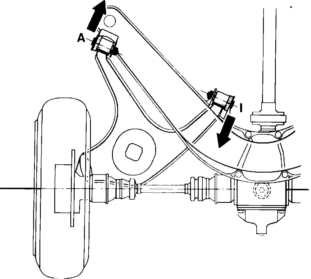 Toe-in can be corrected or the nominal value can be attempted by the installation of eccentric rubber mounts in the semi-trailing arms. Semi-trailing arm eccentric rubber mount part No. 1233520765 is available to correct toe-in. To reduce toe-in, install outer rubber mount, (A) with arrow pointing toward the rear as shown in Fig. 1 and inner rubber mount (1), pointing toward the front.