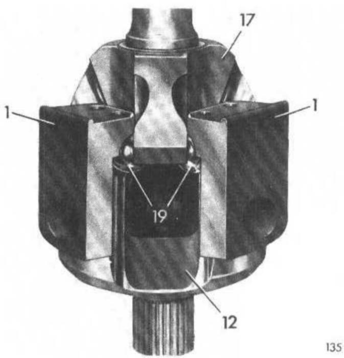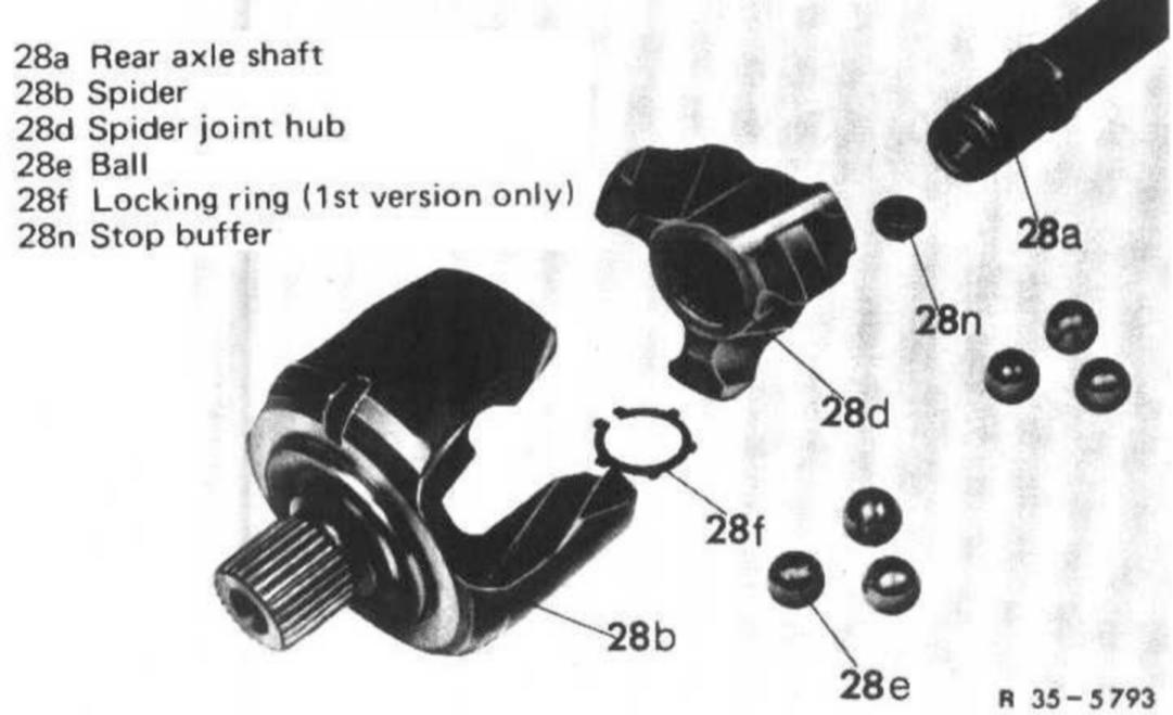 Note: When new, the balls are mounted with a slight overlap. In used joint, balls and spider are moving somewhat easier. The rear axle shaft is completely replaced only whenever torsional play is showing up.