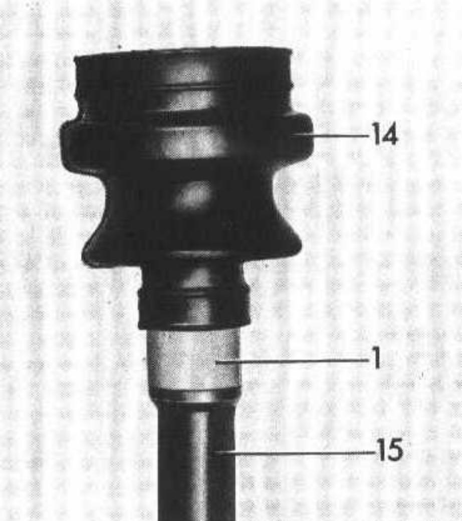 13 Slip new rubber sleeve (14) on rear axle shaft.