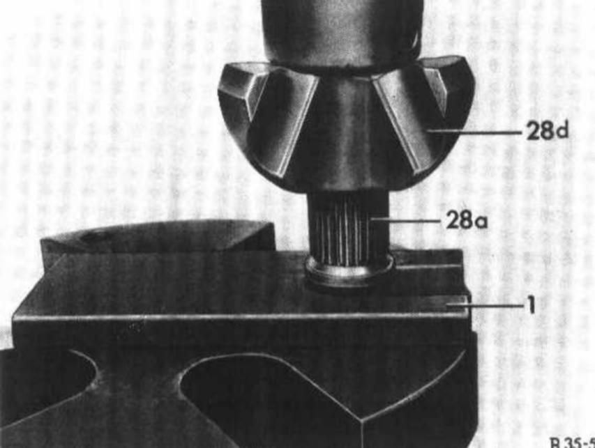 16 Press on spider joint hub (28d) of 1st version up to stop surface of rear axle shaft.