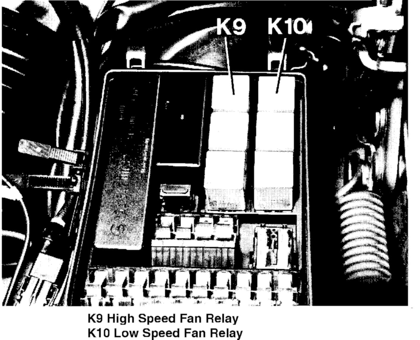 ^ Low speed is activated by the dual function pressure switch in the receiver drier at approx. 290 psi (20 bar), via relay (K10) and a pre-resistor.