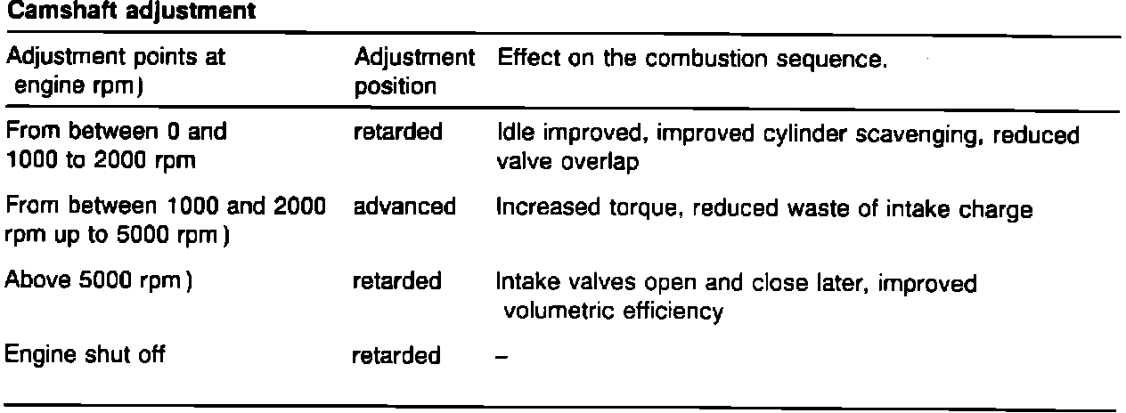 Camshaft adjustment is dependent on engine coolant temperature and on the engine load and "RPM" map which is preprogrammed within the CIS-E 5 control unit.