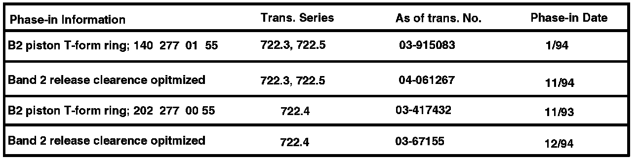 Install improved B2 piston teflon seal ring (T-form ring) and adjust Band 2 release clearence to minimum specification 5.5 mm.