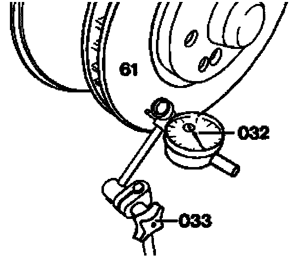 If the pedal travel differs during the test drive (particularly after driving through a curve), check the wheel bearing axial play at the front wheel hubs (33-0300). Measure lateral runout of brake discs at outer diameter. For this purpose use dial gauge holder (033) 363 589 02 21 00 and dial gauge Al DIN 878 (032). Replace brake discs as pair if lateral runout is > 0.12 mm.