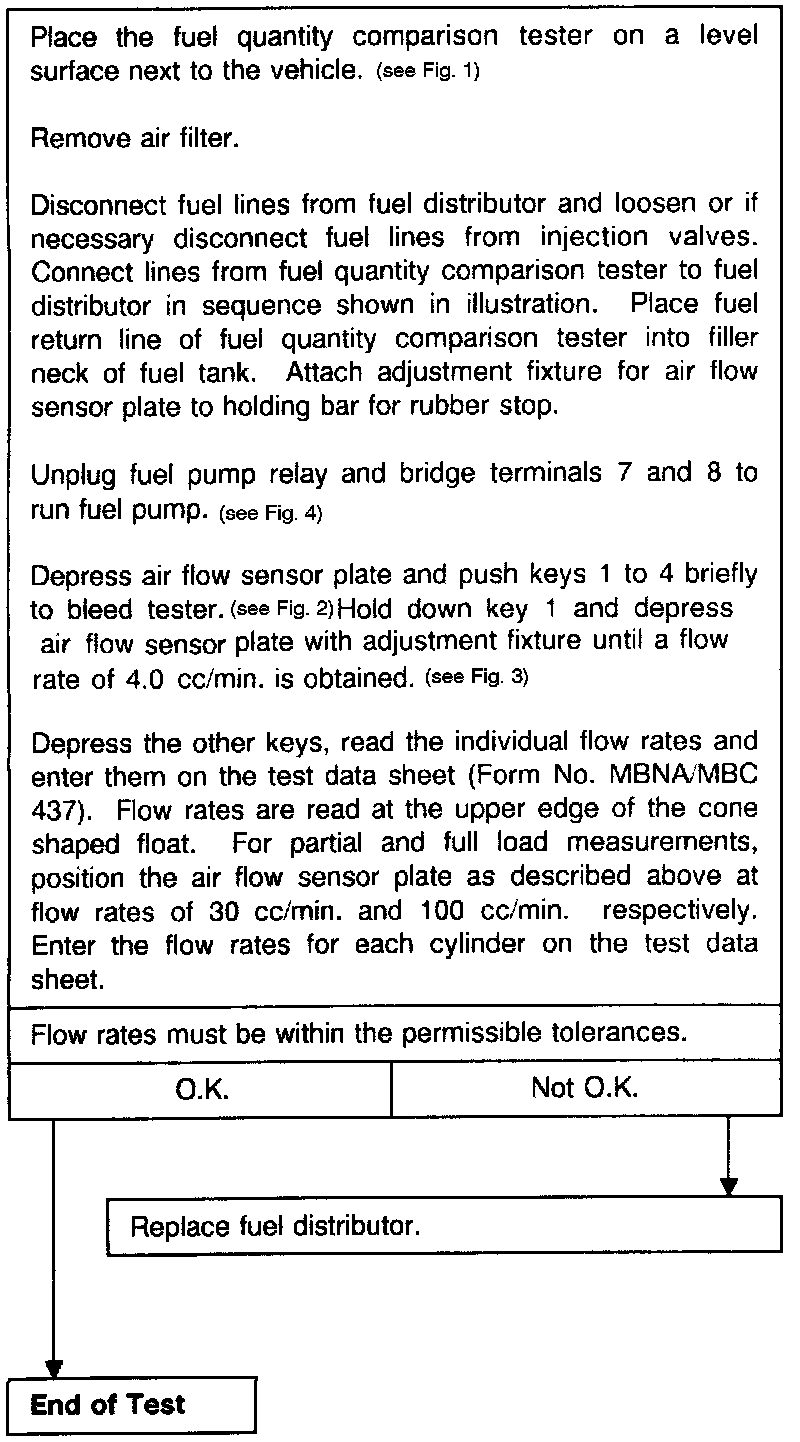 NOTE: This test is performed with the engine not running. The operating conditions (idle, partial load and full load) are simulated by depressing the air flow sensor plate with an adjustment fixture (included with special tool 908 589 00 21 00).