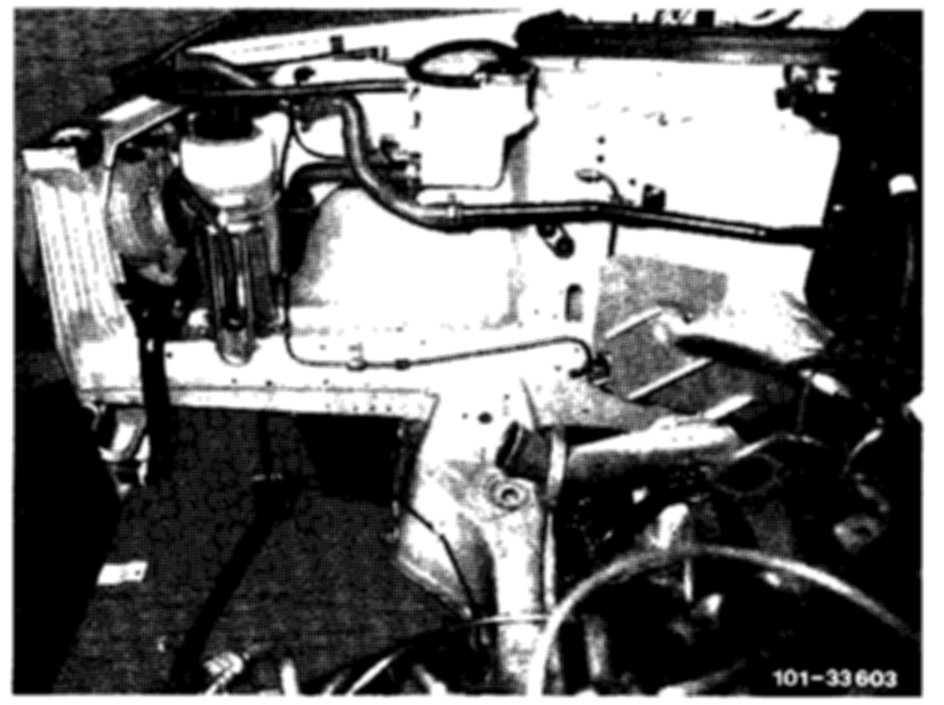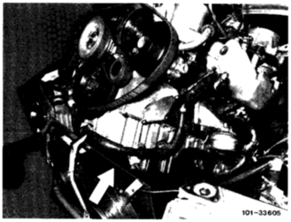 5. Protect condenser with suitable panel. Unbolt holder for refrigerant lines (2 bolts) and compressor (4~bolts). The compressor (arrow) remains in the vehicle with the refrigerant lines connected.
