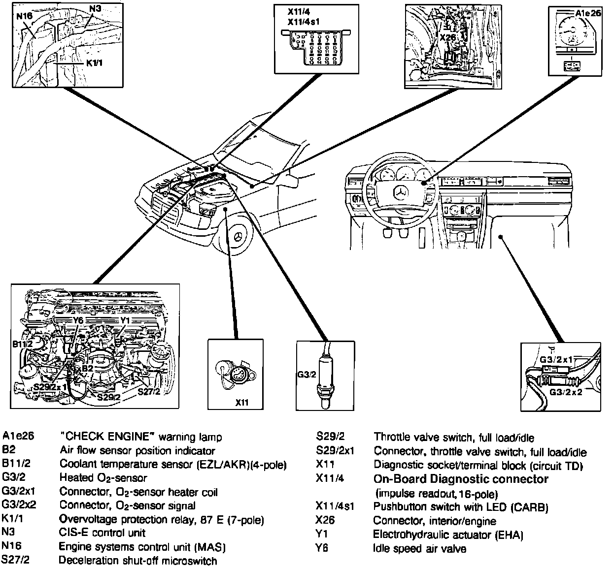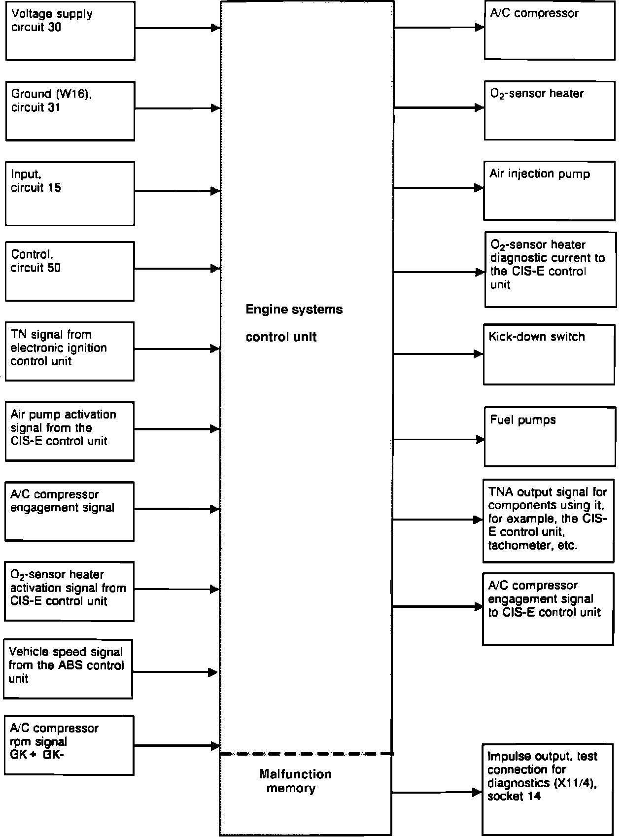 The CIS-E 5 Computerized Engine Control system consists of the basic CIS (Continuous Injection) fuel injection system and electronic controls which are added for air/fuel mixture correction, idle stabilization and exhaust emission control. The electronic control unit (ECU) receives input signals from the airflow sensor position indicator (potentiometer), coolant temperature sensor, transistorized ignition system (EZL/AKR), throttle valve switch, micro switch, altitude sensor, vehicle speed sensor, engine systems (MAS) control unit, transmission range indicator, intake air temperature sensor and oxygen sensor. The ECU processes these input signals and calculates the appropriate correction values which are sent to the electro-hydraulic actuator (air/fuel mixture control), camshaft timing adjuster, EGR switchover valve, electric purge valve and the idle speed control valve.