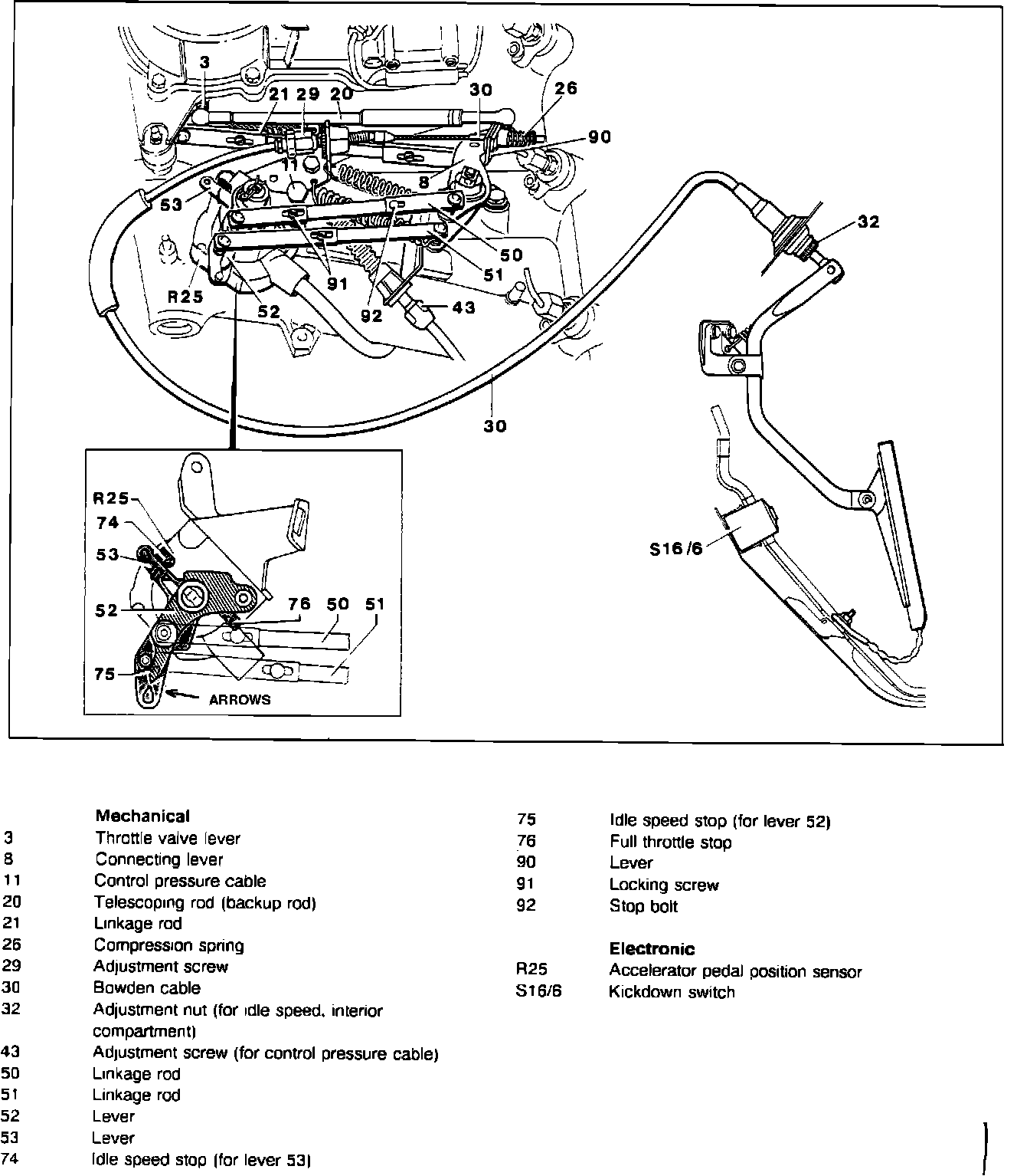 ^ Verify that the lever (53) is resting against the full throttle stop (76) on the accelerator position sensor (R25) without tension. If necessary adjust screw (29) to attain the correct setting.