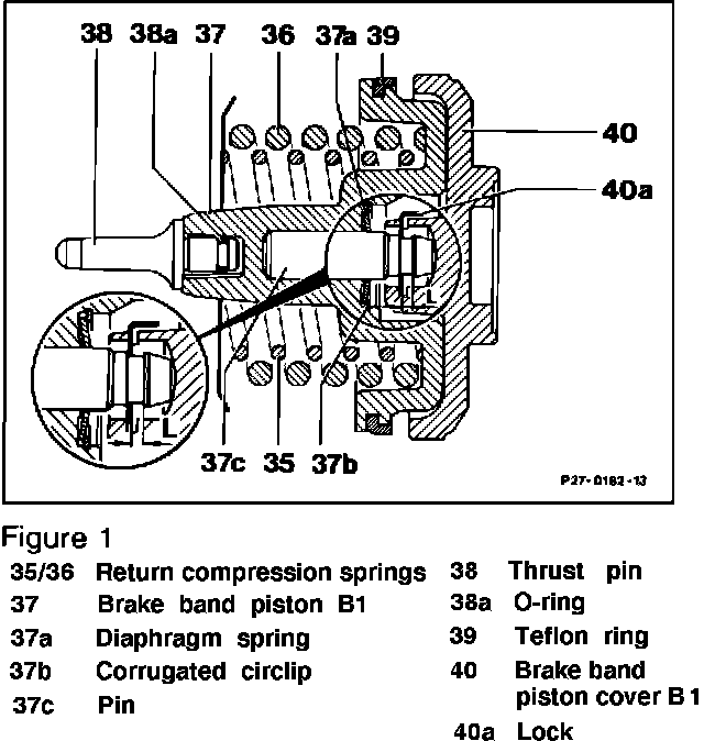 The brake band B1 is engaged by the oil pressure build-up between the brake band piston (37) and the brake band piston cover (40). The brake band piston is shifted against the force of the return compression springs (35/36) until the brake band B1 is applied. This lifting action of the brake band piston causes the diaphragm spring (37a) to pull along the pin (37c), while the stroke "L" (inset) is covered first. If the stroke is greater, the lock (40a) retains the pin and the diaphragm spring (37a) is shifted on the pin (automatic adjustment) (Figure 1).