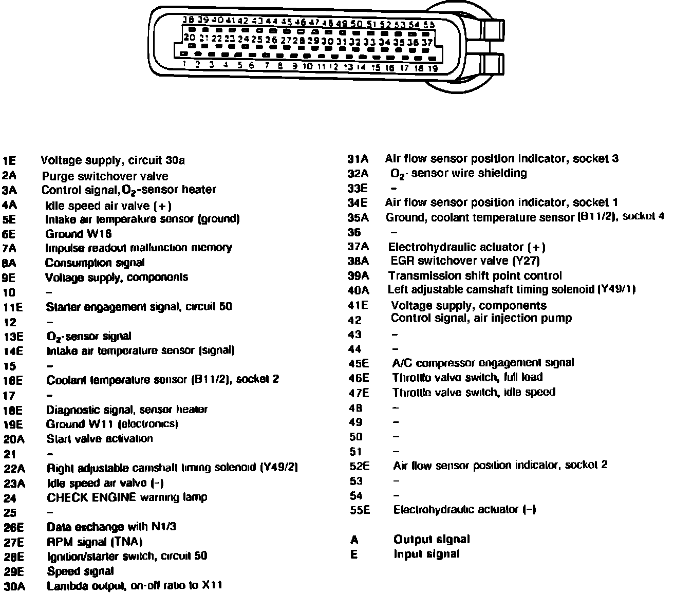 The CIS-E 5 control unit actuates the EGR switchover valve. Coolant temperature, air flow sensor position indicator, and throttle valve input are determining factors for CIS-E 5 control of the EGR system. Furthermore, the diagnostics of the CIS-E 5 control unit tests the function of the EGR system. During deceleration fuel cutoff the EGR switchover valve is actuated for 1.5 seconds. From the intake vacuum signal, which is measured by the ignition control unit, it can be determined whether the EGR system is functioning. If a fault is recognized, it is stored in the fault memory of the CIS-E 5 control unit.