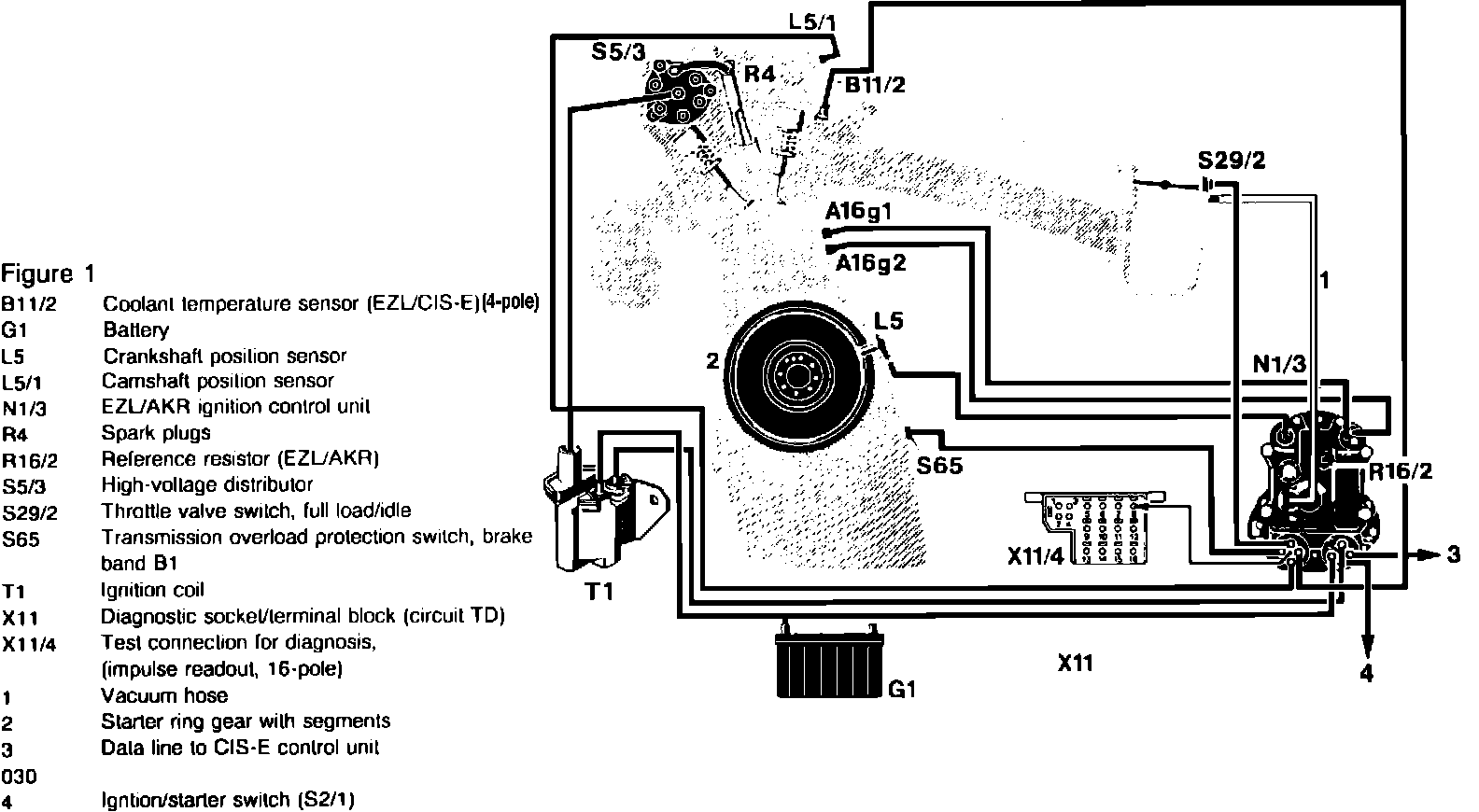 The EZL/AKR control module compares information from these inputs with ignition maps for typical load and speed ranges which are stored in the microcomputer. The optimal ignition timing for each operating condition is instantaneously determined from the stored maps and the power output stage switches the primary current of the ignition coil between terminals 16 and 31 of the control module. Furthermore, a TD (engine speed) reference signal is provided to the CIS-E 5 control module, tachometer, MAS control module, on-board diagnostic connector, and the diagnostic socket. To further increase operating reliability, a data exchange circuit has been added between the EZL/AKR control module and the CIS-E 5 control module. Information concerning the coolant temperature, intake air temperature and the intake manifold absolute pressure is continuously compared by the control module of each system.