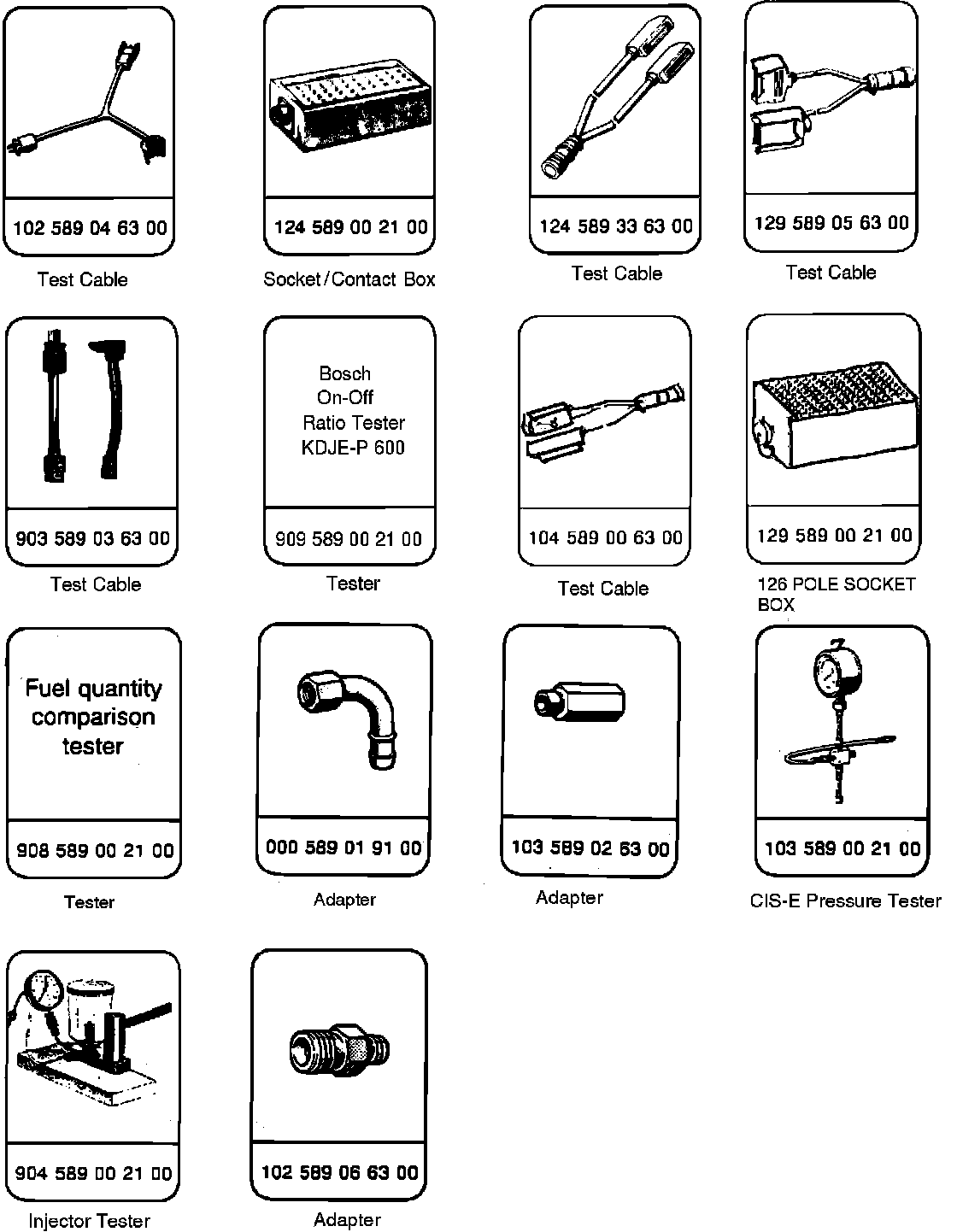 Certain basic Mercedes Benz test equipment or equivalent will be necessary to carry out tests outlined in this section. The use of incorrect test equipment may result in damage to CIS-E system components, other related systems, or the test equipment used. If the Mercedes Benz socket box is not available careful backprobing of the control unit harness connectors will be necessary. It may be necessary to partially disassemble the connectors; care must be taken to prevent damage to the wiring and individual pin connectors
