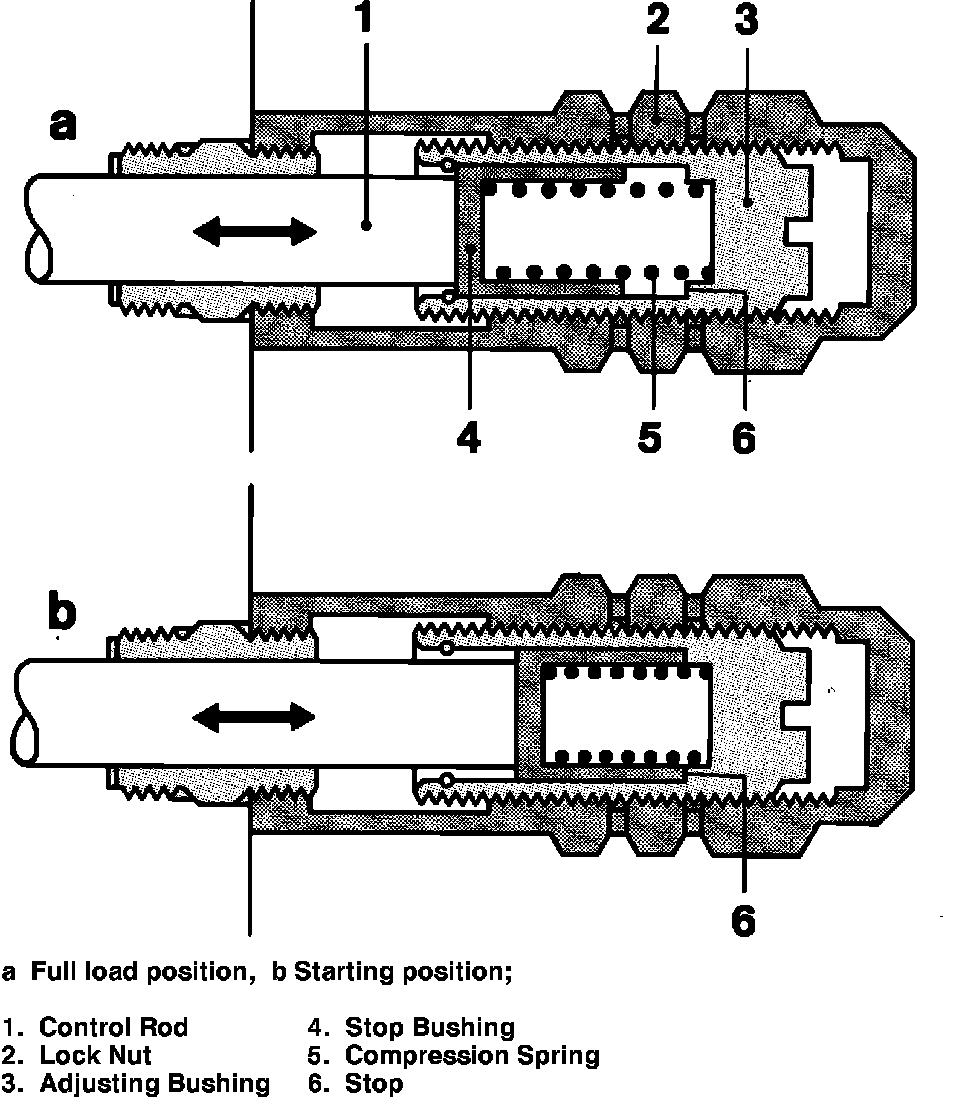 The travel of the control rod is usually limited (full load delivery) by an adjustable stop. There are various types of control rod stops. A distinction is made between control rod stops installed on the injection pump and the governor.