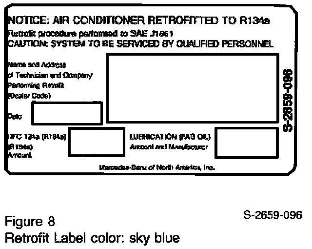 1. Using a permanent marking pen, note fill capacities of R134a refrigerant and PAG oil in the appropriate boxes of the new R134a retrofit label (part number S-2659-096), along with the conversion date and information on the individual performing retrofit (Figure 8). Do not use the old label (part no.140 317 10 20), because it does not comply with the US Federal EPA regulation