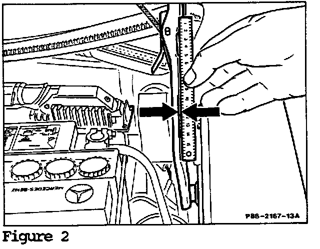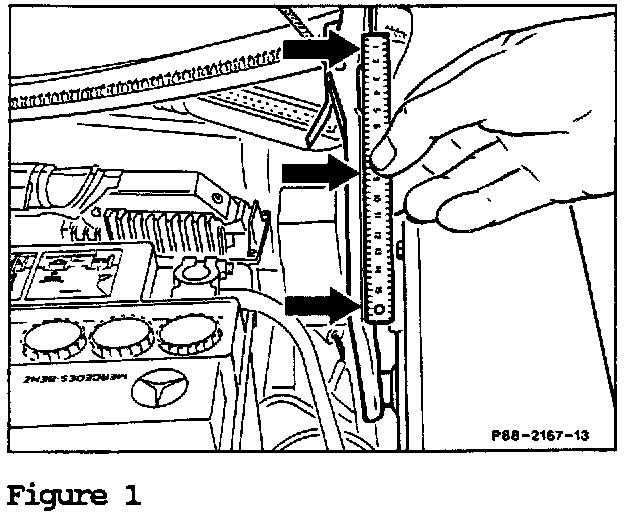 Place a steel ruler (approx. 150 mm long) against the outer edge of the front engine hood hinge lever (Figure 1).