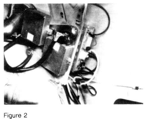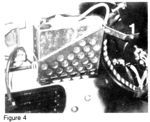Place the tuner/amplifier unit in the basket and temporarily fasten the assembly to the studs in the fender above the bumper. Install the upper mounting bracket for the tuner/amplifier basket with the supplied screw. In vehicles not provided with a predrilled mounting hole for the upper bracket, first mark and drill a 5/64 in. (2 mm) hole (1, Figure 4).
