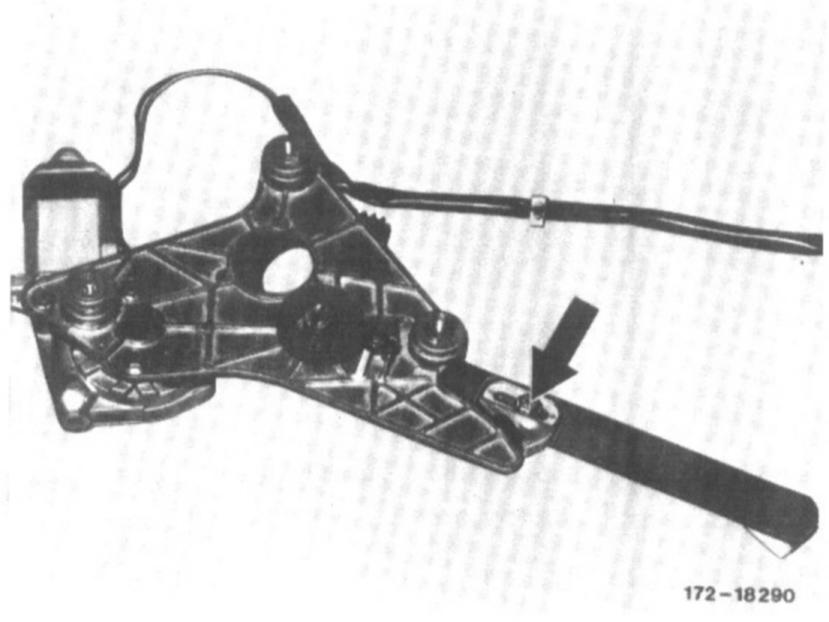 7. Remove window opener arm on window opener rail toward the rear and position window opener motor at upper assembly hole.