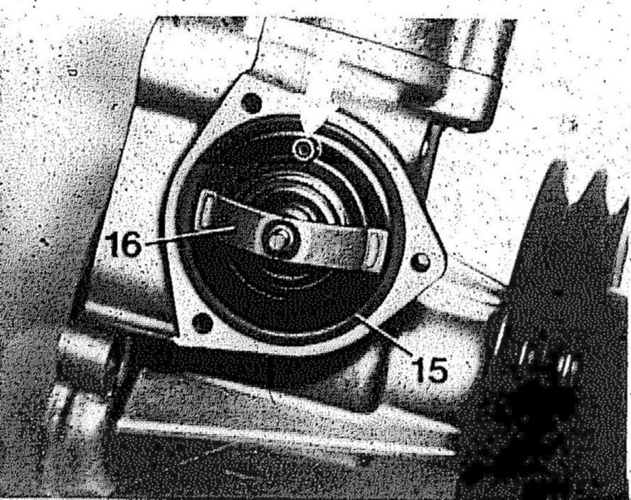 7 If required, install coolant thermostat (16) with a new sealing ring (15) in such a manner that the ball valve is on the top (arrow). During installation, ensure free movement of the ball in the valve.
