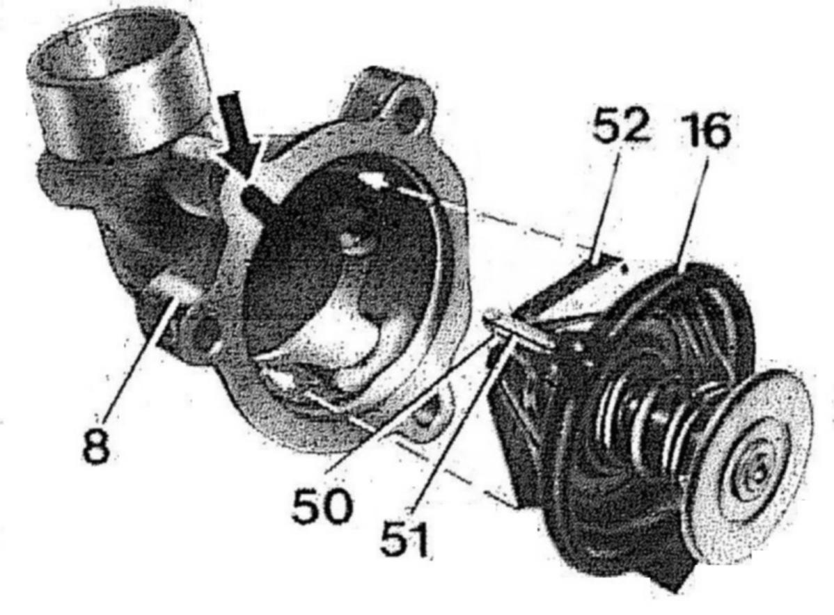 9 If required. fit new gasket (16) to coolant thermostat. Install coolant thermostat in inlet connection (8) in such a way that the lever (50) engages with pin (51) in the recess (arrow) and that the two ends of the spring (52) engage in the retaining lugs (dashed arrows).
