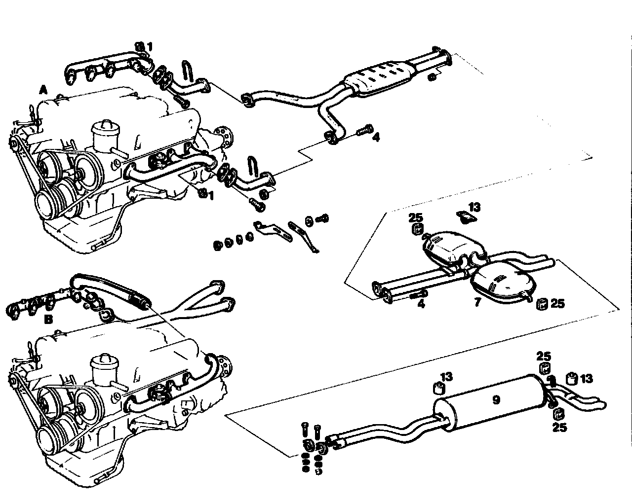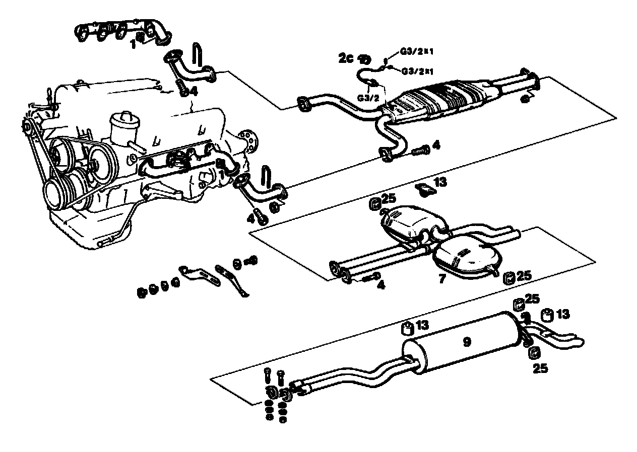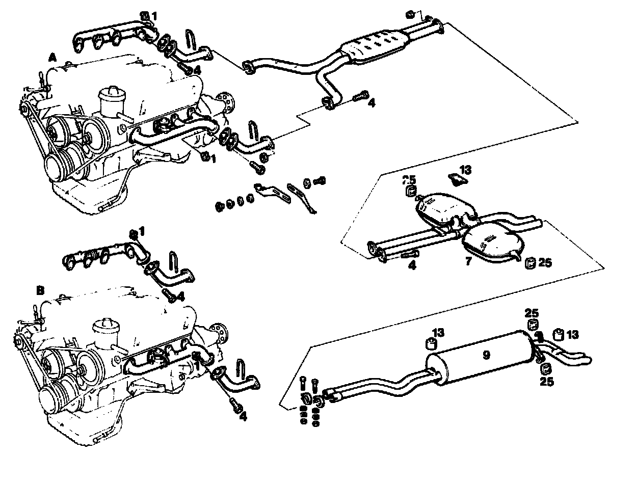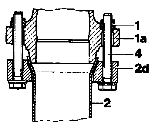 Do not tighten the flange joint to the exhaust manifold until the complete system is attached in the rubber rings. Ensure that the front exhaust pipe is correctly located. Tightening torque of bolts 20-25 Nm.