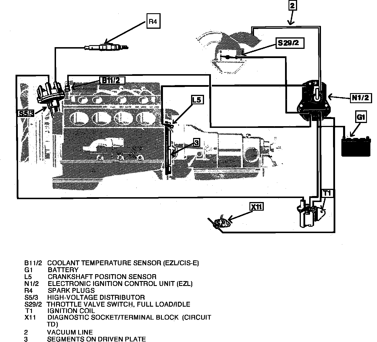 The EZL electronic control unit (ECU) receives input signals from the ignition switch, crankshaft position sensor, intake manifold vacuum signal, coolant temperature sensor, throttle valve switch, and the CIS-E control unit. Like the CIS - E control unit, the EZL control unit processes these signals, calculates the appropriate dwell/ignition angle, and simultaneously switches the ignition coil ground circuit.