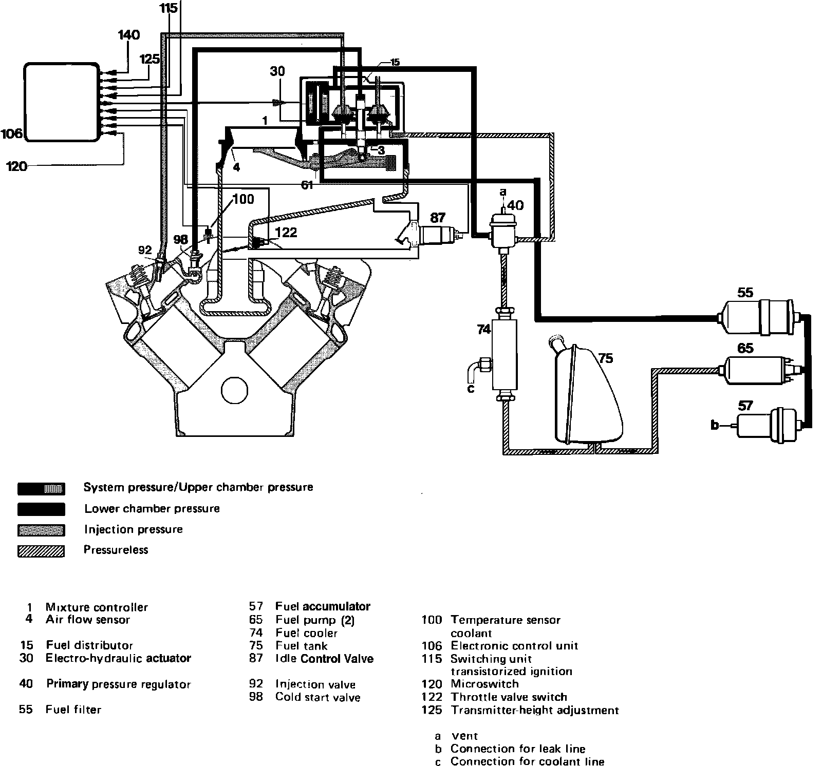 A mechanical hydraulic injection system provides the basis for the Bosch KE-Jetronic (CIS-E) fuel system. The mechanical portion of the CIS-E system consists of the mixture control unit (air flow meter and fuel distributor), primary pressure regulator, fuel accumulator, cold start valve, fuel injectors, pumps, filter, lines, tank and fuel cooler. In addition, electrical controls have been added for increased flexibility to meet todays more stringent performance and exhaust emission requirements. Refer to "COMPUTERIZED ENGINE CONTROLS" for a detailed description of electronic components.