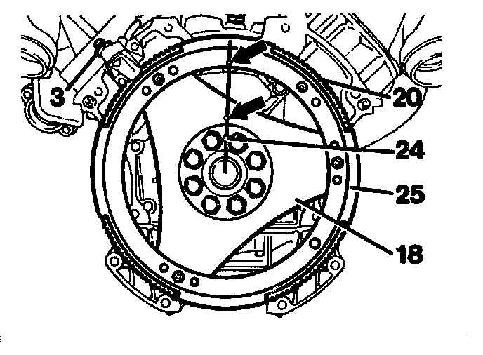 NOTE: The ring gear must be installed so that the 3.5 mm dia, holes (arrows) in the ring gear and in the driven plates are at the same angle otherwise proper operation of the ignition is not assured.
