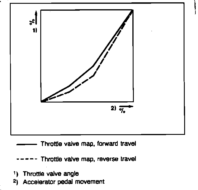 If reverse gear is selected, the system control receives an input signal from the starter lockout/backup lamp switch. This selects a throttle valve map in the system control. During reverse driving up to approx. half of the pedal travel, the throttle valve opens more slowly. This improves driveability in reverse.