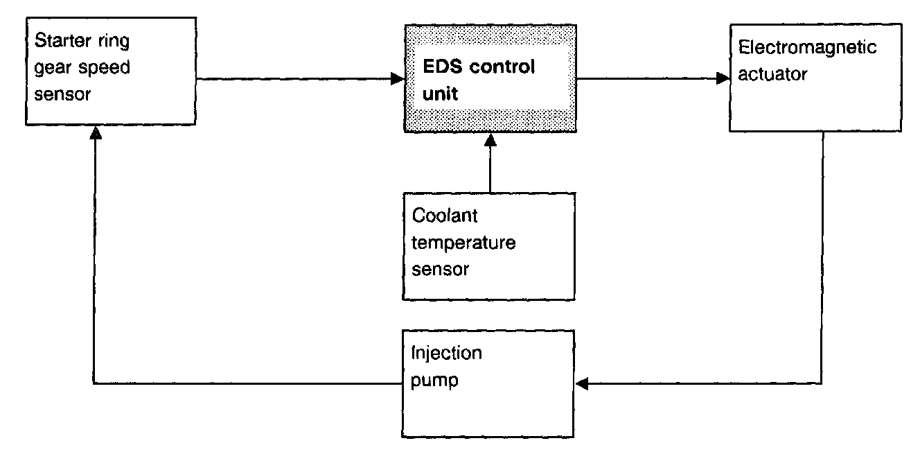 Electronic idle speed control (ELR)The starter ring gear speed sensor (L3) picks up the engine speed (144 impulses per revolution) and sends it in the form of an AC voltage signal to the EDS control unit. The EDS control unit processes the rpm signal and performs an nominal/actual value comparison.