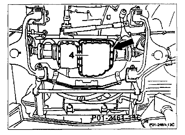 12 Unplug connector (arrow) of the oil level sensor on the left at oil sump and at front axle housing, respectively.