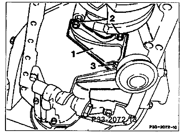 14 Unscrew bolts (2) and bolt (3). Take off support (1) at intake snorkel of oil pump.