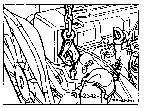 Caution! When raising the engine, ensure that the fan does not damage the radiator and also pay attention to the rear suspension lug, oil filter and coolant hoses.