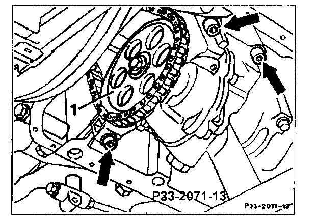 21 Lower front axle housing as far as possible. Unscrew bolt for sprocket (1) and take oft sprocket (1). Unscrew bolts (arrows) and take out oil pump downward. Take off front axle housing to the rear. Pay attention to drive chain of oil pump.