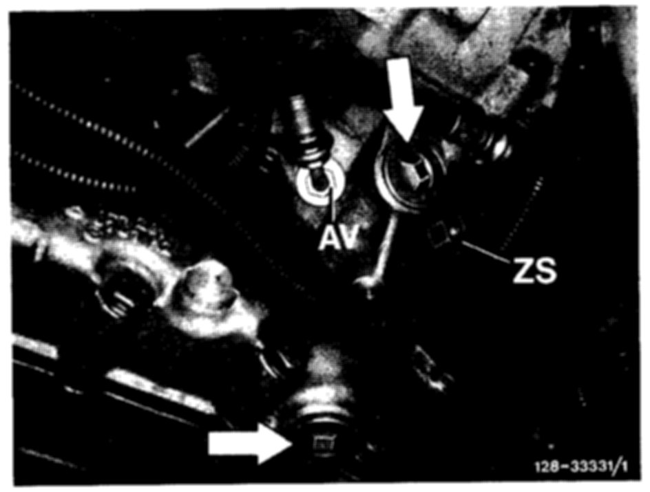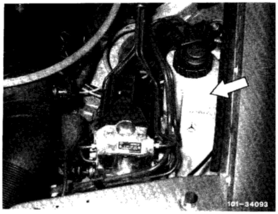 38. With manual transmission: Disconnect hydraulic line (arrow) to slave cylinder at hose union. Seal lines with plugs or draw fluid from the rear chamber of the combined reservoir with a suction gun.
