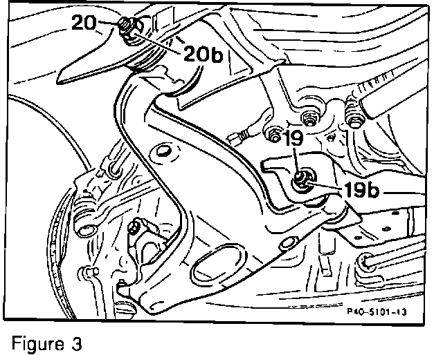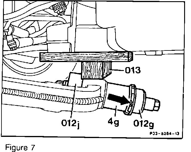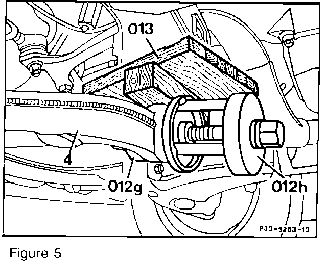 4. Remove nut and eccentric bolt (20 and 20b, Figure 3). Remove nut (19b, Figure 3) and slide eccentric bolt (19, Figure 3) as far forward as possible. Pull the lower control arm down from the front axle cross member rear bracket and wedge lower control arm down with a suitable block (013, Figure 5, next page). During reassembly obtain new eccentric bolt nuts (19b and 20b, Figure 3). Tightening torque: 150 N-m.