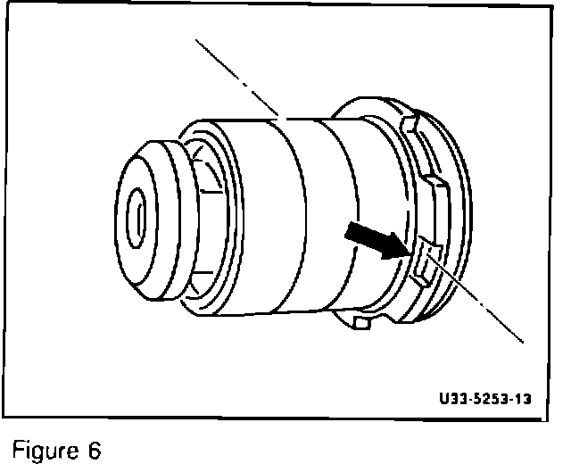 7. Install the hydraulic bushing into the control arm from the trailing side. Line up the small rectangular indentation in the bushing shoulder (arrow, Figures 6, 7 and 8) with the welded seam on the control arm (see figures 7 and 8 for correct alignment). Unlike the three larger notches, this small rectangular indentation does not extend through the bushing shoulder.